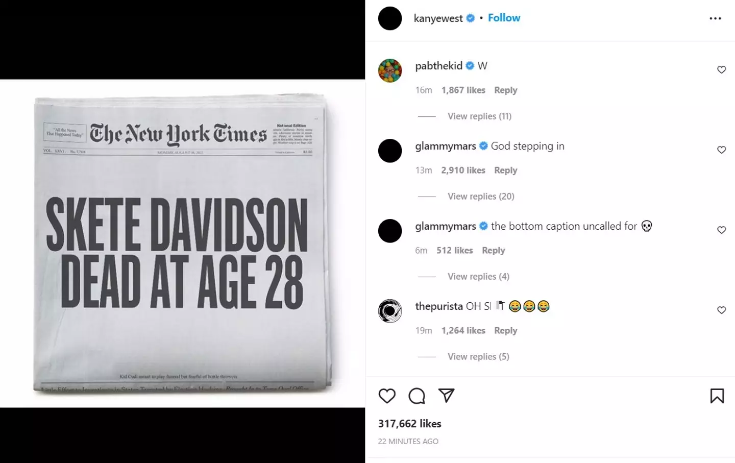 For his first post back since deleting his previous posts, Ye created a mock newspaper headline, which read: "Pete Davidson dead at age 28."