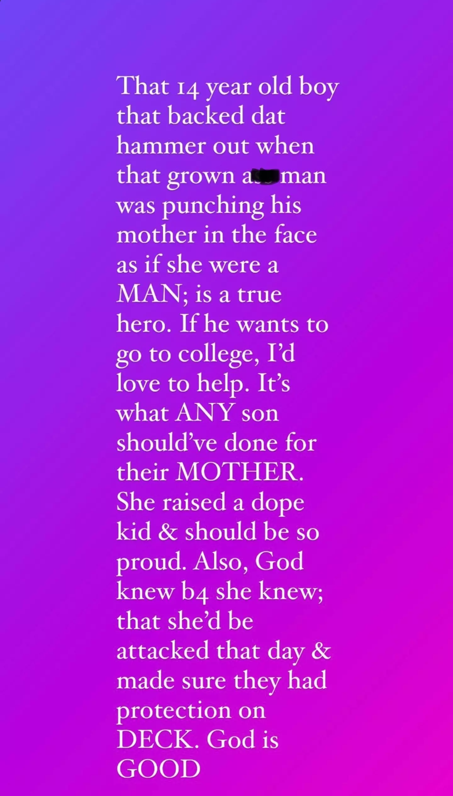 The 40-year-old wrote: "That 14-year-old boy that backed dat hammer out when that grown a** man was punching his mother in the face as if she were a MAN; is a true hero.