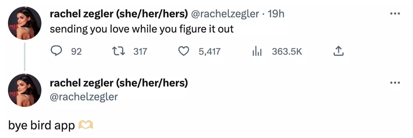 She followed this up with a simple: "Bye bird app," accompanied by a 'heart hands' emoji.