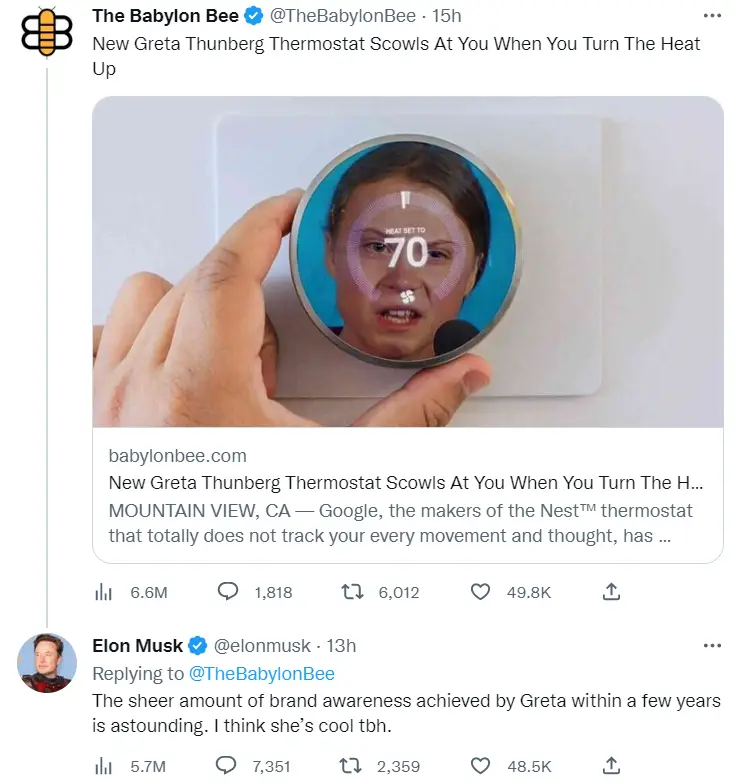 On Friday (30 December), Musk responded to a satirical article posted by The Babylon Bee with the headline, “New Greta Thunberg Thermostat Scowls At You When You Turn The heat Up”.