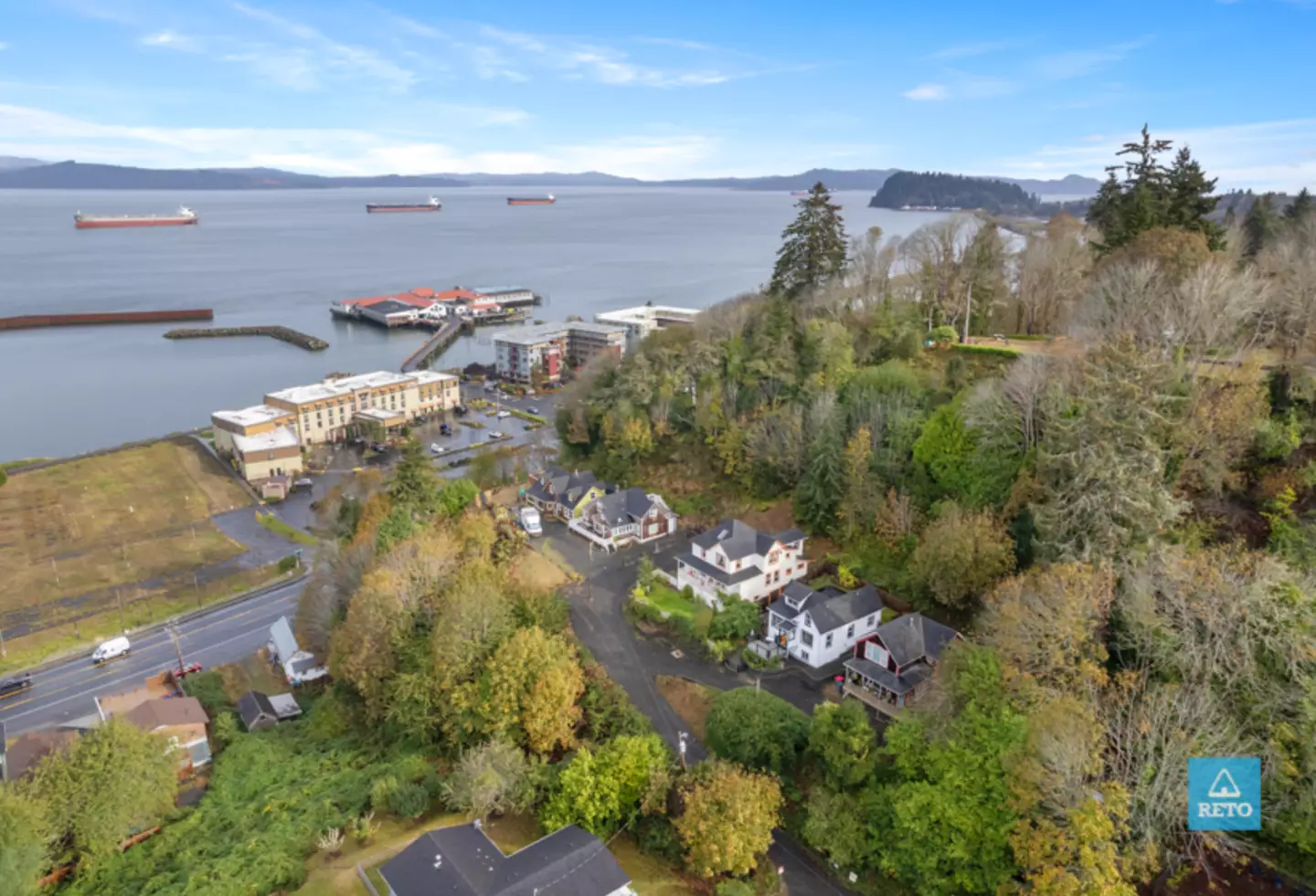 The four-bedroom house is located on a cul-de-sac in the coastal city of Astoria, Oregon, and is situated by the Pacific Ocean and the Columbia river.