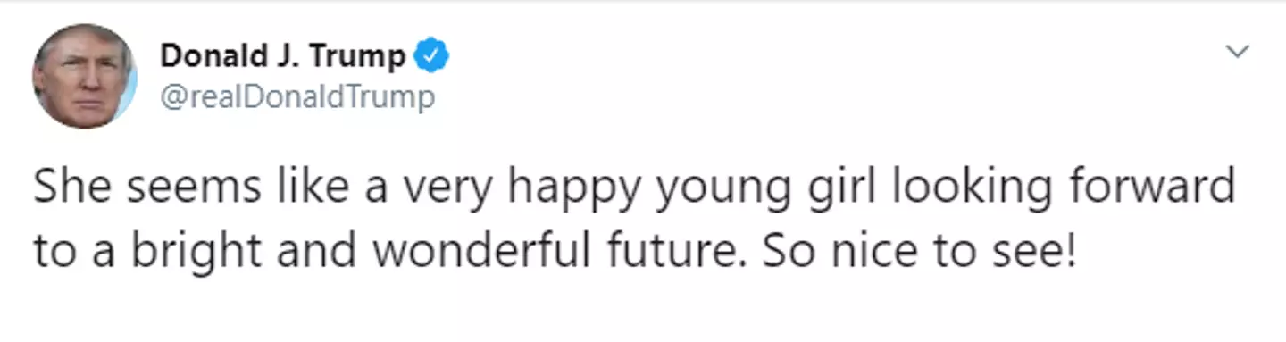 Trump tweeted: "She seems like a very happy young girl looking forward to a bright and wonderful future. So nice to see!"