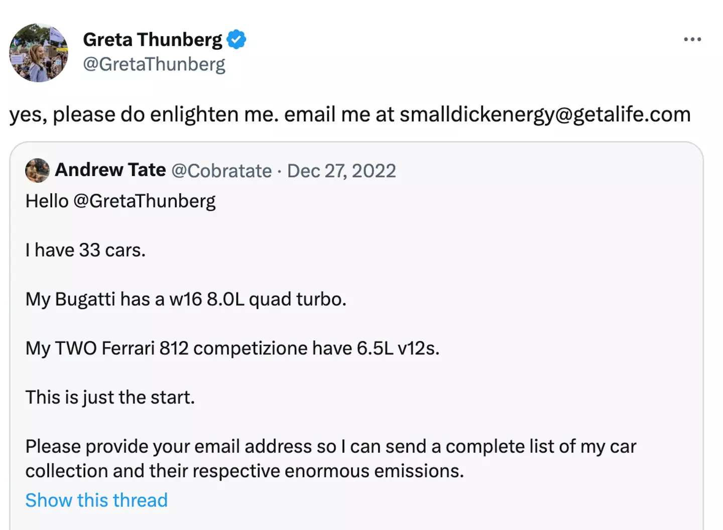 Thunberg royalty roasted Tate after he boasted about his carbon emitting car collection in December last year.