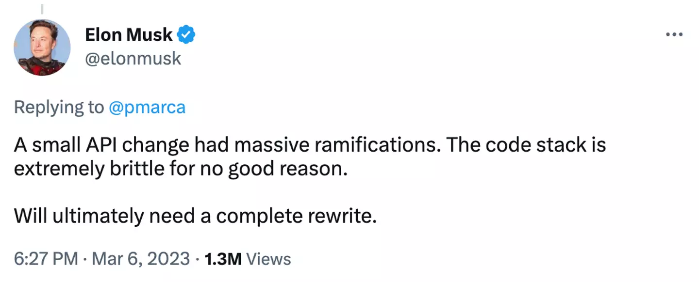 Responding to a tweet, he wrote: "A small API [application programming interface] change had massive ramifications. The code stack is extremely brittle for no good reason. Will ultimately need a complete rewrite."