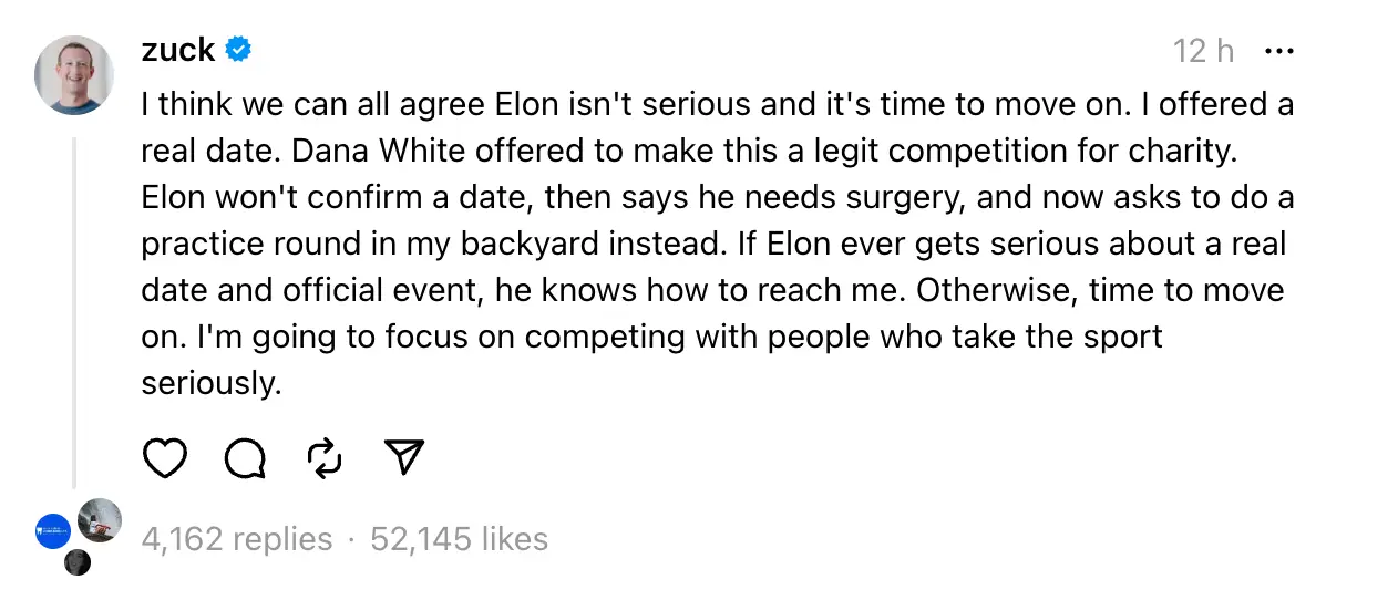 Over the weekend, Zuckerberg wrote via Threads: "Elon won't confirm a date, then says he needs surgery, and now asks to do a practice round in my backyard instead.