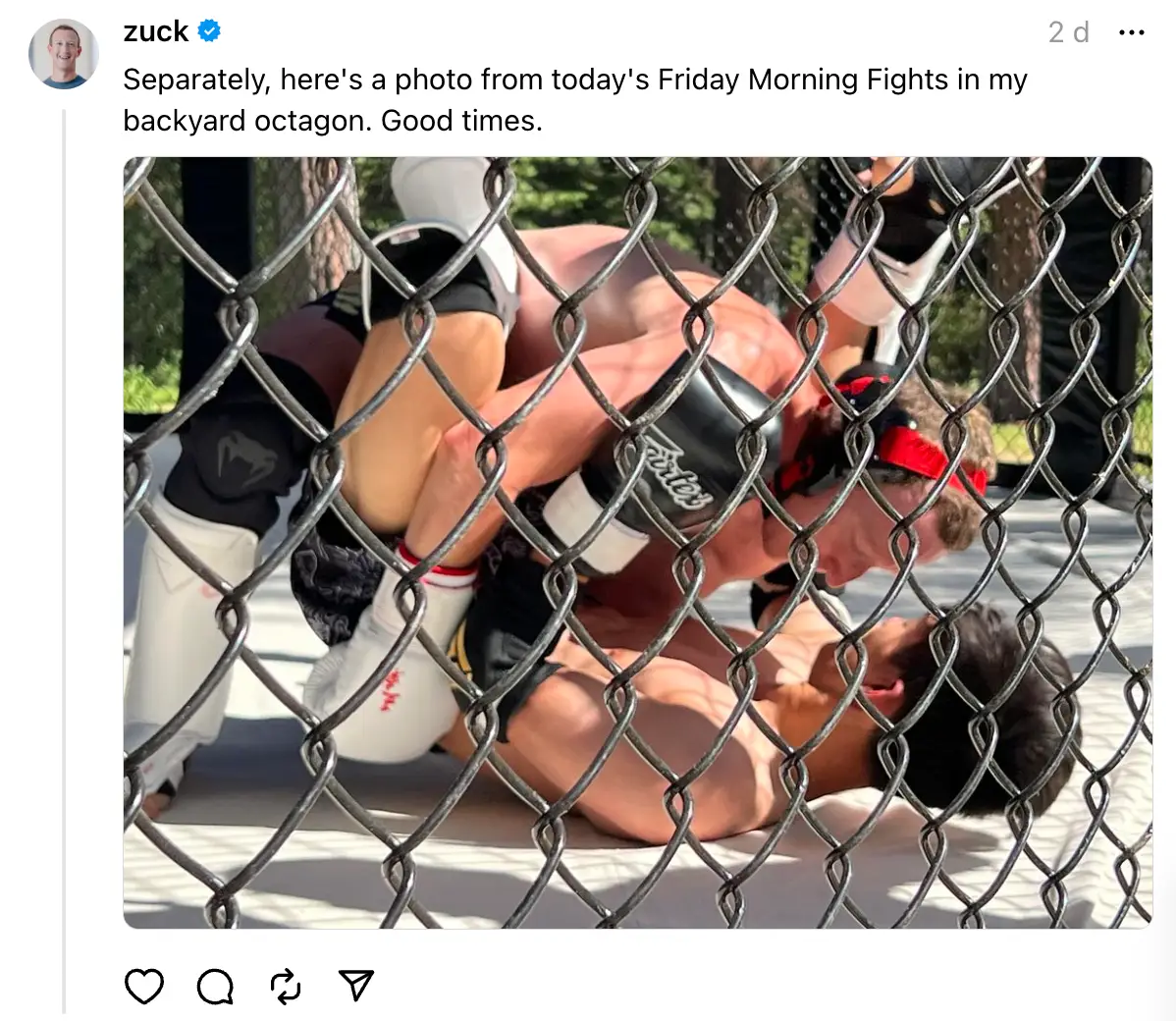 “Separately, here's a photo from today's Friday Morning Fights in my backyard octagon. Good times,” he wrote.