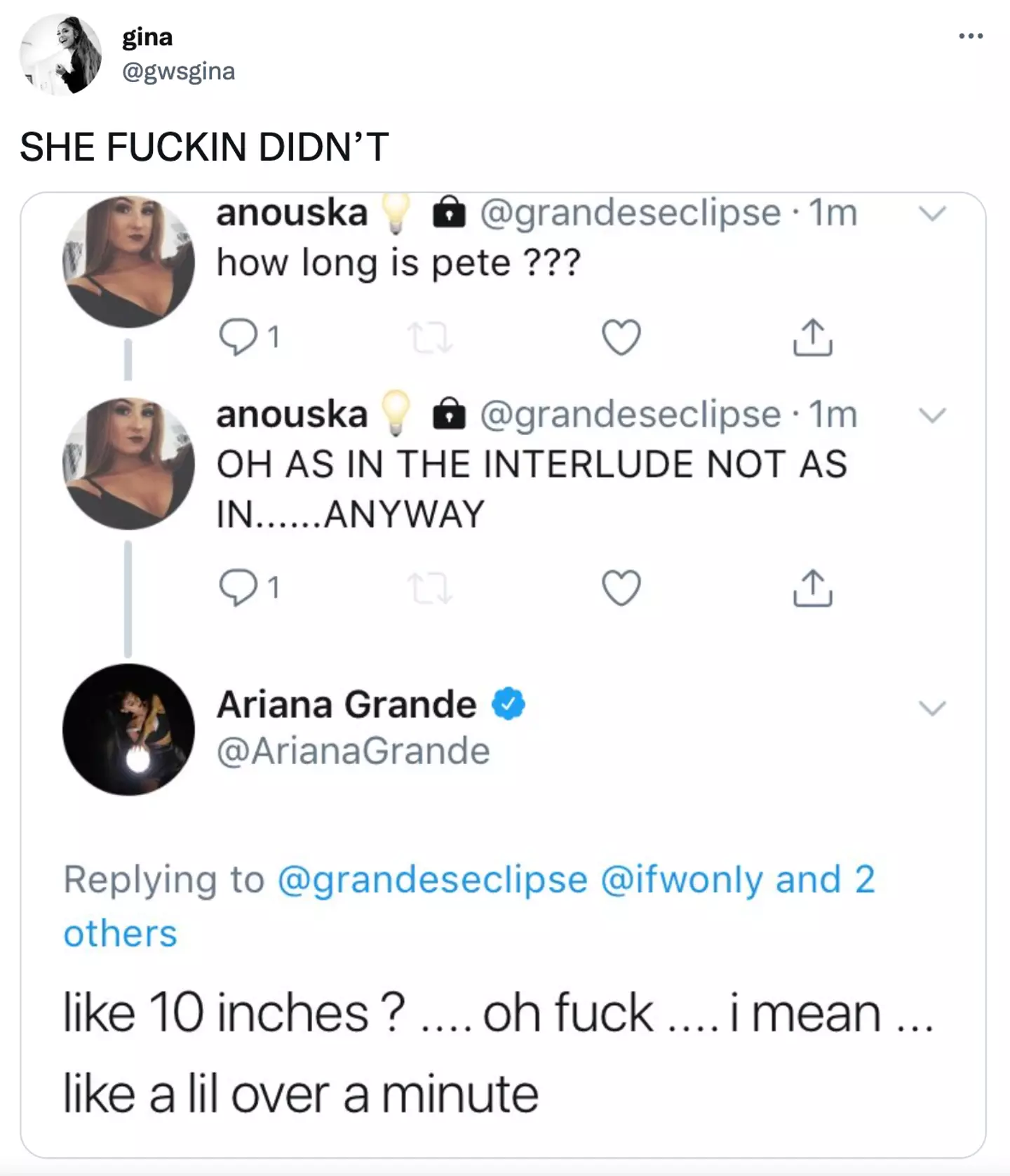 But it was too late. Ariana replied before reading the clarification, thus sealing Pete’s status as a trousersnake among comedians: "Like 10 inches?…. oh f**k… I mean a little over a minute."