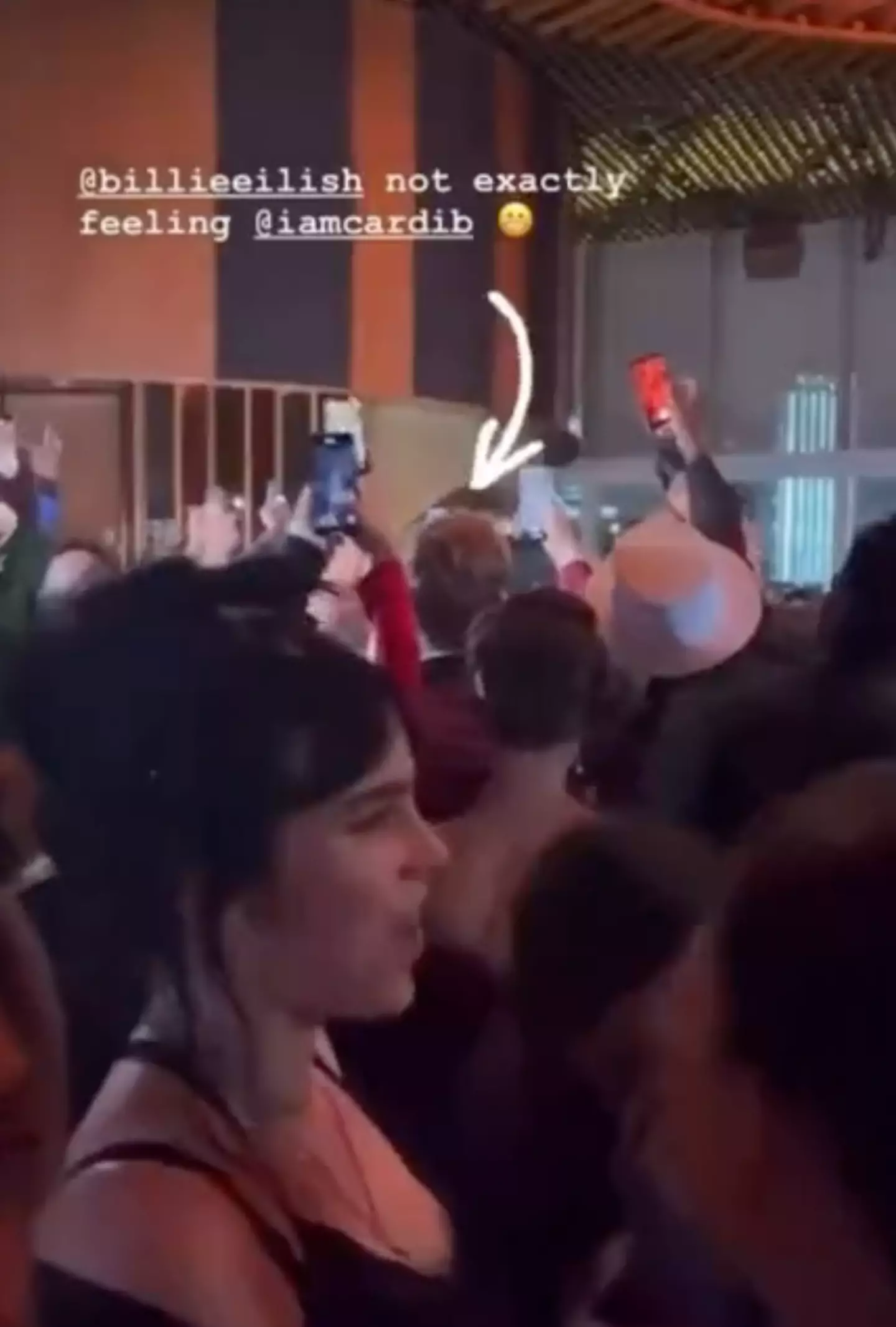 The clip then cuts to Cardi B performing, while Eilish watches on in the foreground of the video – at one point turning from the stage to speak to her companion in the crowd, saying something is ‘so weird’.