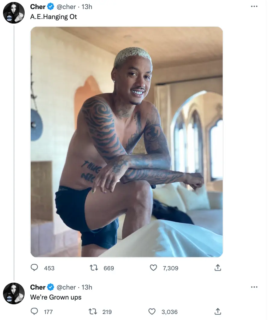 Sharing a snap of him wearing just his underpants on Twitter, Cher wrote: “A.E.Hanging Ot [sic]” following it up with the words: “We’re Grown ups.”
