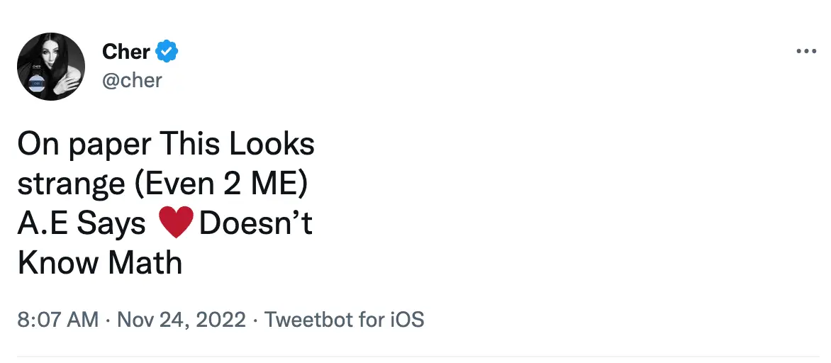 In another post, she added: “On paper This Looks strange (Even 2 ME) A.E Says [love heart] Doesn’t Know Math”.