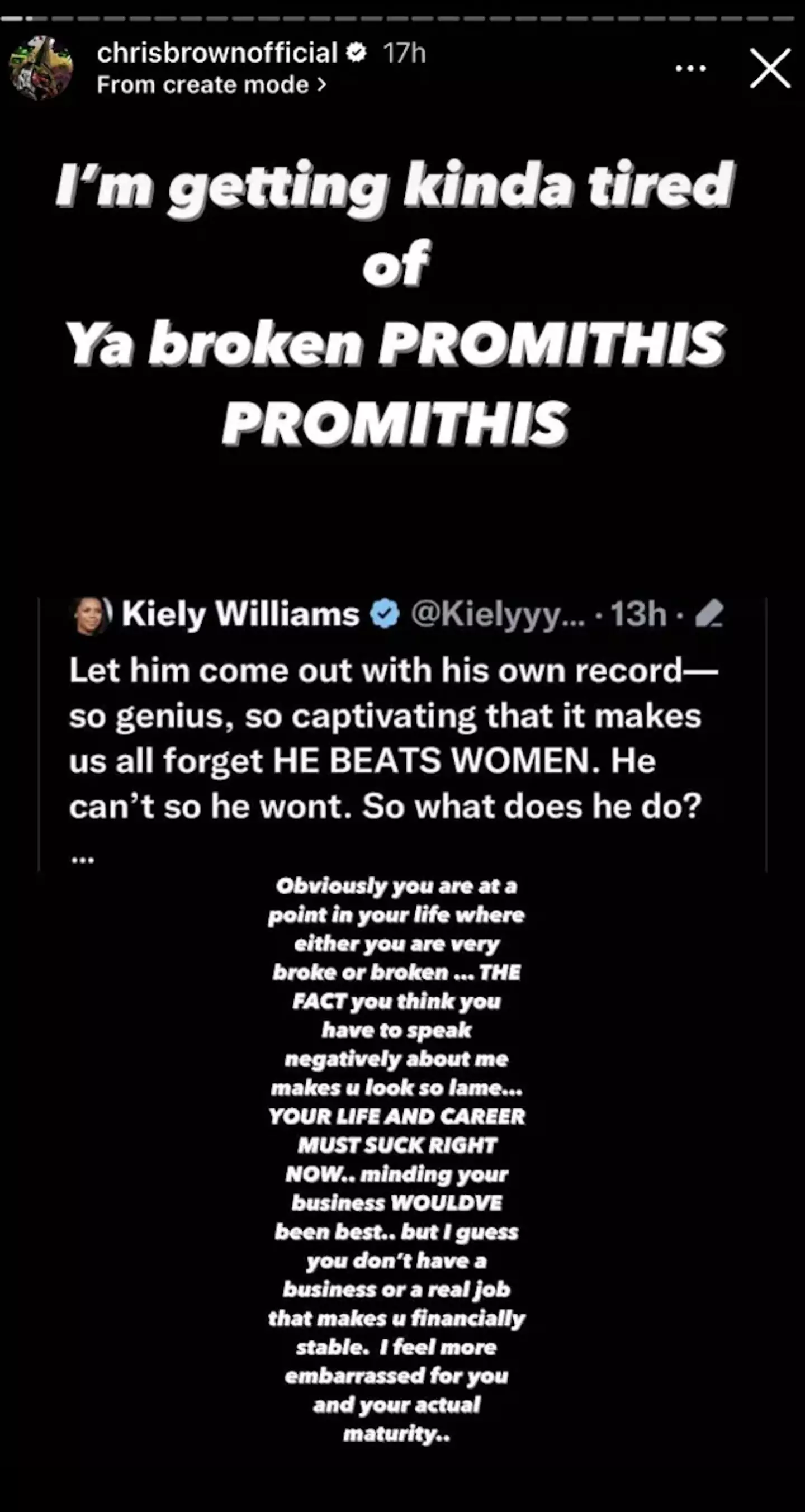 Brown began the series of posts with a screenshot from Kiely Williams, a fellow singer, who tweeted: "Let him come out with his own record—so genius, so captivating that it makes us all forget HE BEATS WOMEN. He can’t so he wont. So what does he do?"