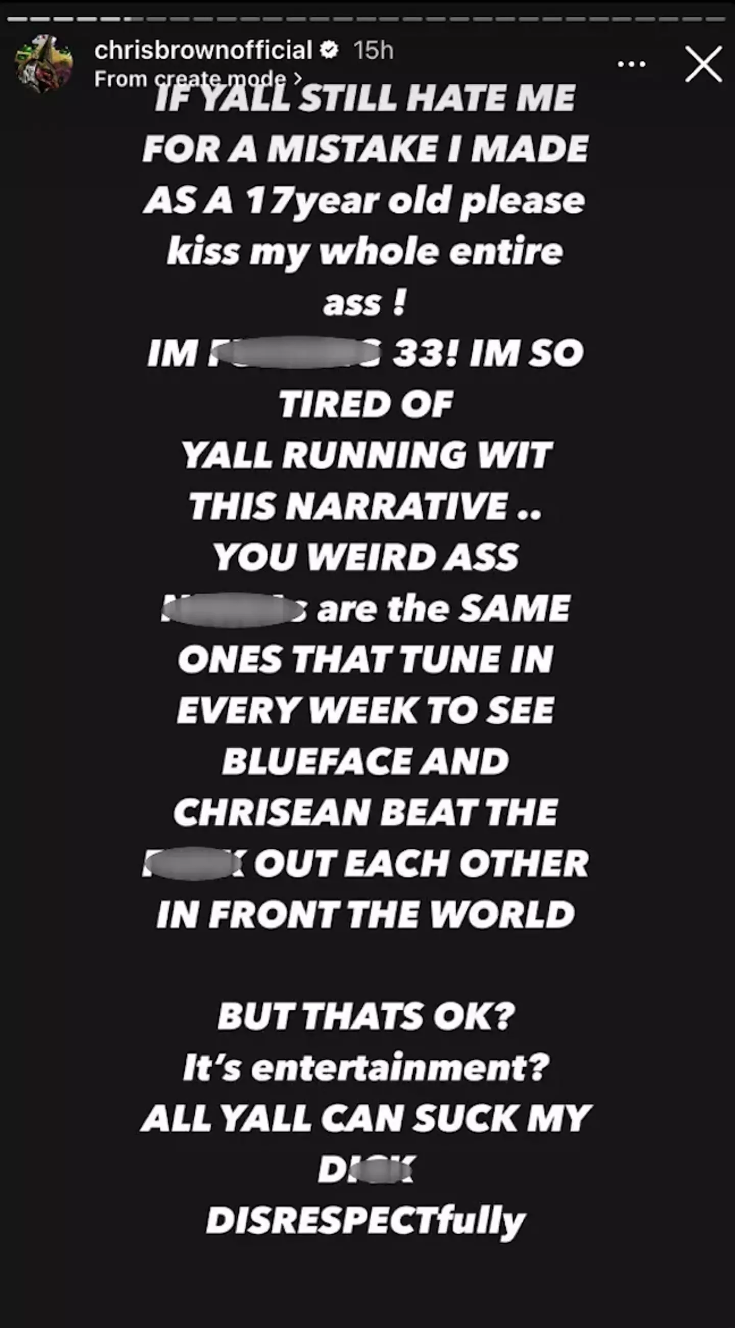 The singer continued: "If y'all still hate me for a mistake I made as a 17 year old please kiss my whole entire a**,” Brown wrote in his post.
