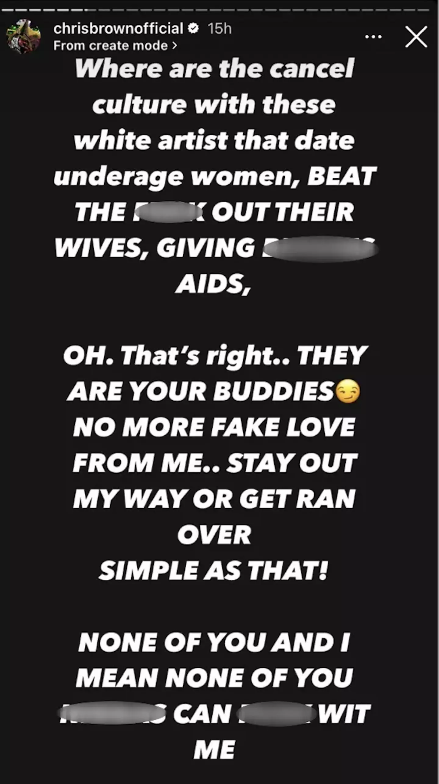 He wrote: "Where are the cancel culture with these white artist that date underage women, beat the f*** out of their wives, giving b***hes AIDS."