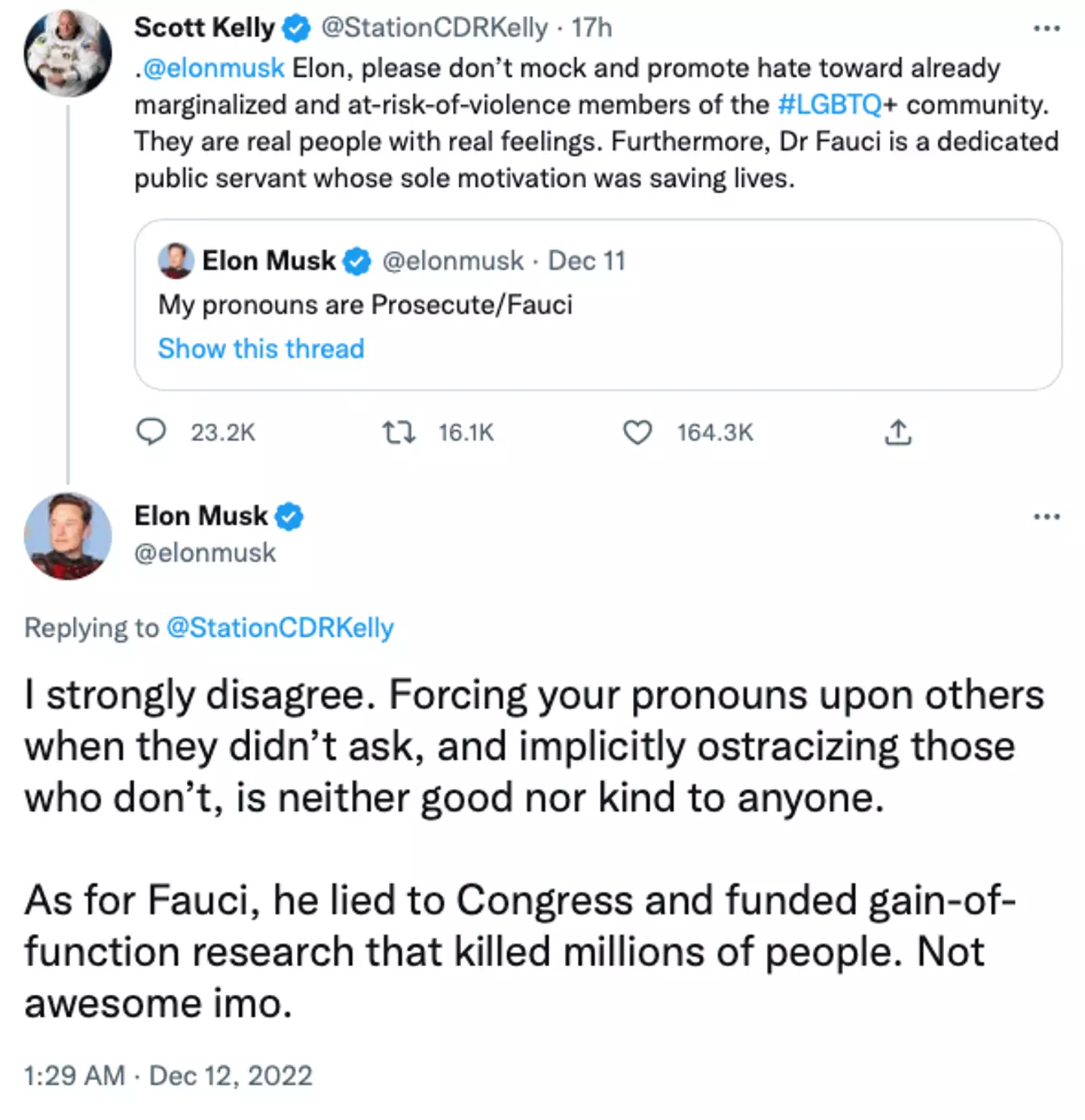 It began with NASA astronaut Scott Kelly telling Musk to not make jokes about pronouns.