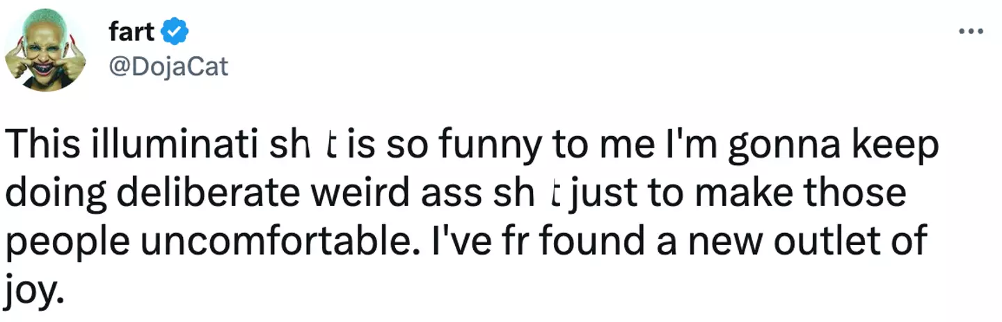 Taking to Twitter this week, the 'Kiss Me More' singer wrote: "This Illuminati s**t is so funny to me I'm gonna keep doing deliberate weird ass s**t just to make those people uncomfortable.