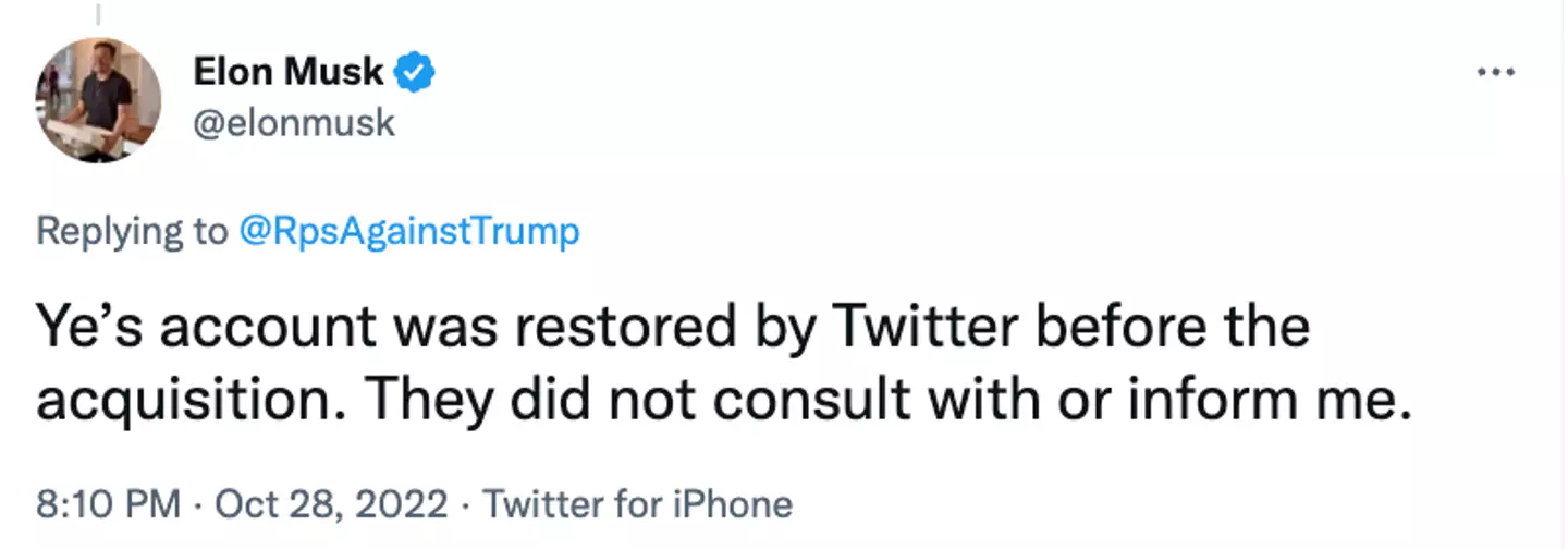 The billionaire replied: "Ye’s account was restored by Twitter before the acquisition. They did not consult with or inform me."