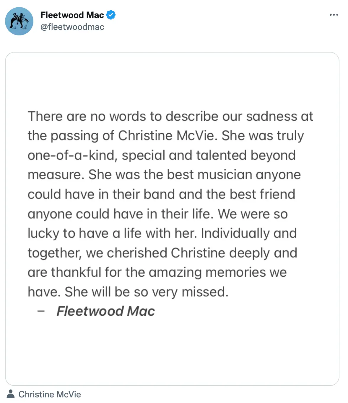 "We kindly ask that you respect the family's privacy at this extremely painful time and we would like everyone to keep Christine in their hearts and remember the life of an incredible human being, and revered musician who was loved universally. RIP Christine McVie."
