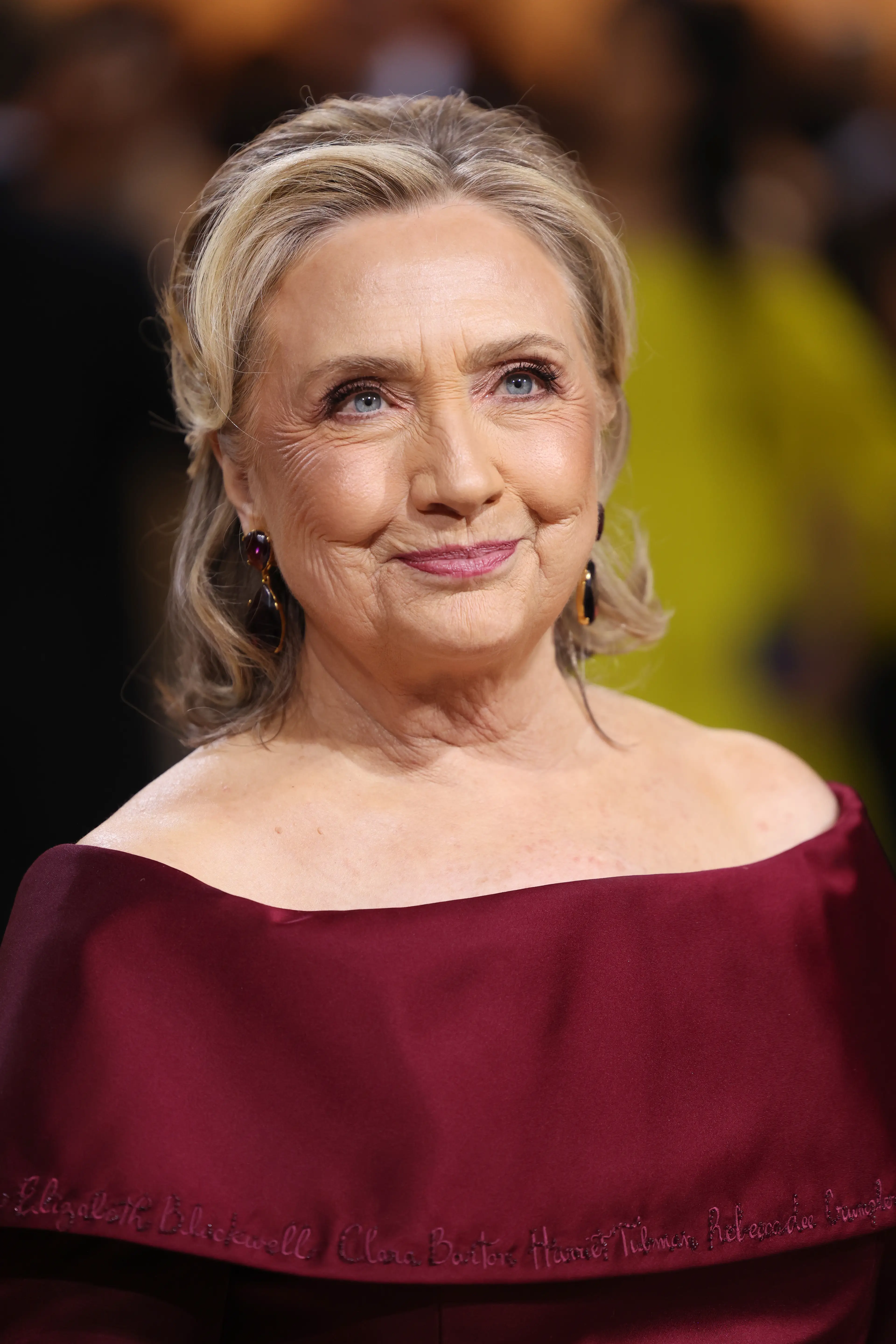 The dress code for 2022 called for ‘gilded glamour’, and Clinton worked with designer Joseph Altuzarra for a custom burgundy gown that celebrated incredible women of the past. She was also accompanied on the red carpet by her longtime aide Huma Abedin, who wore a vibrant yellow gown.