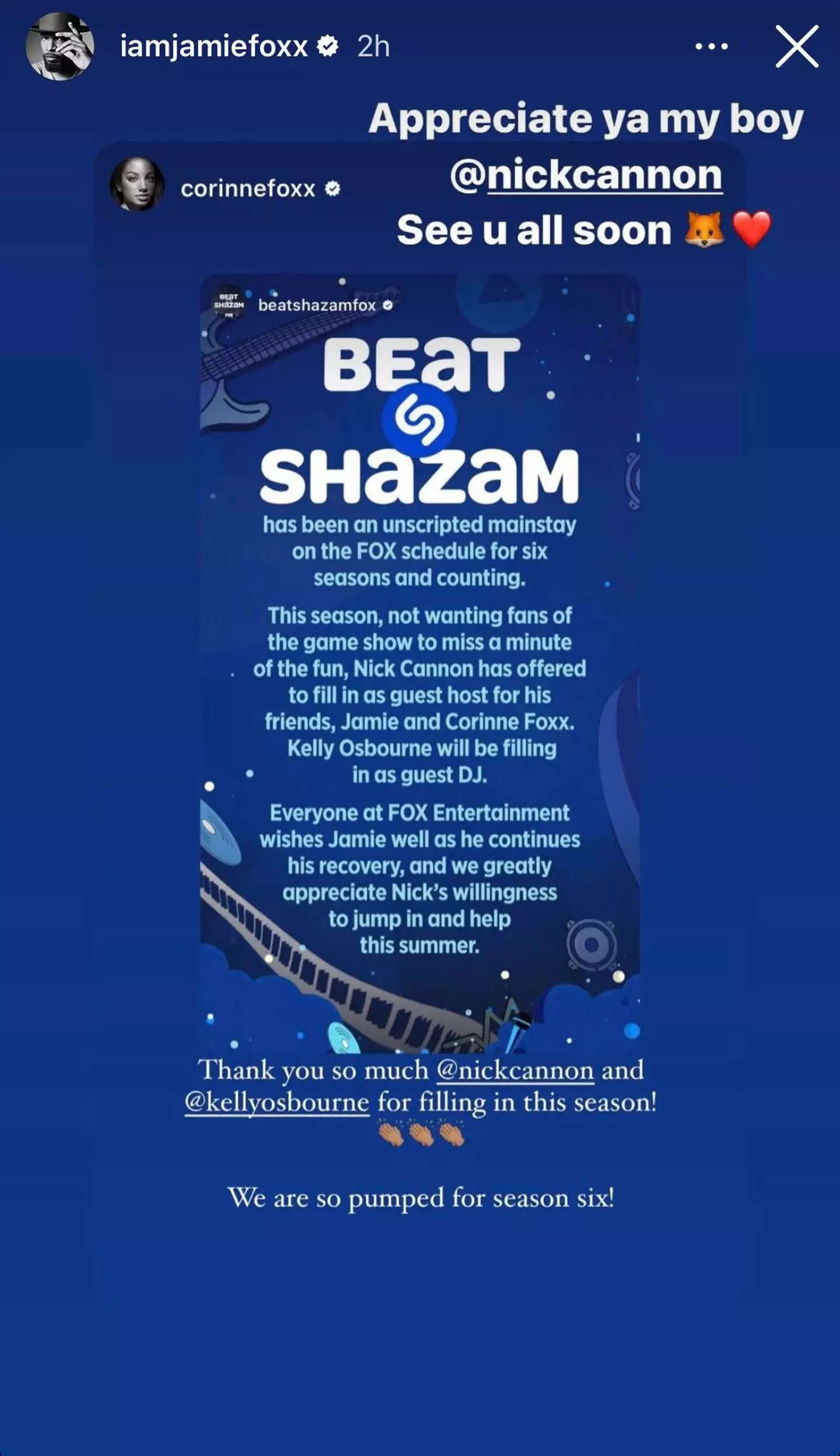 "Appreciate ya, my boy Nick Cannon. See u all soon," he wrote on an Instagram story, alongside a screenshot of a post by his daughter Corinne.