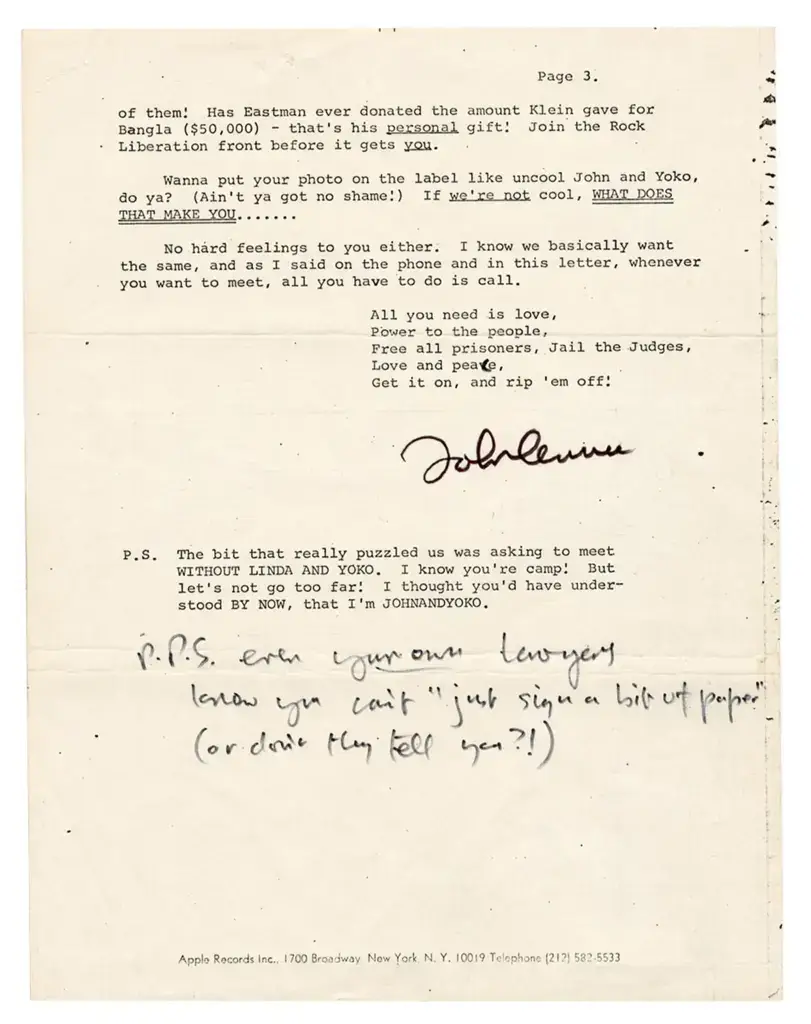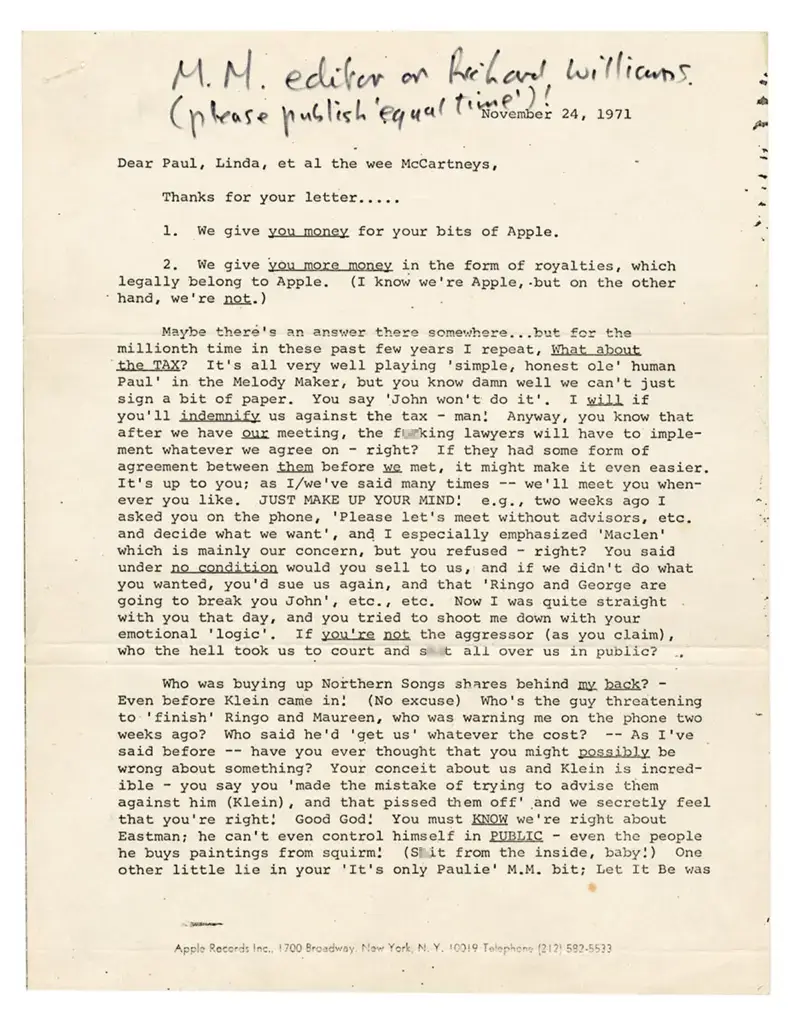 An excerpt from the letter reads: "It's all very well playing 'simple, honest old' human Paul in the Melody Maker, but you know damn well we can't just sign a piece of paper.