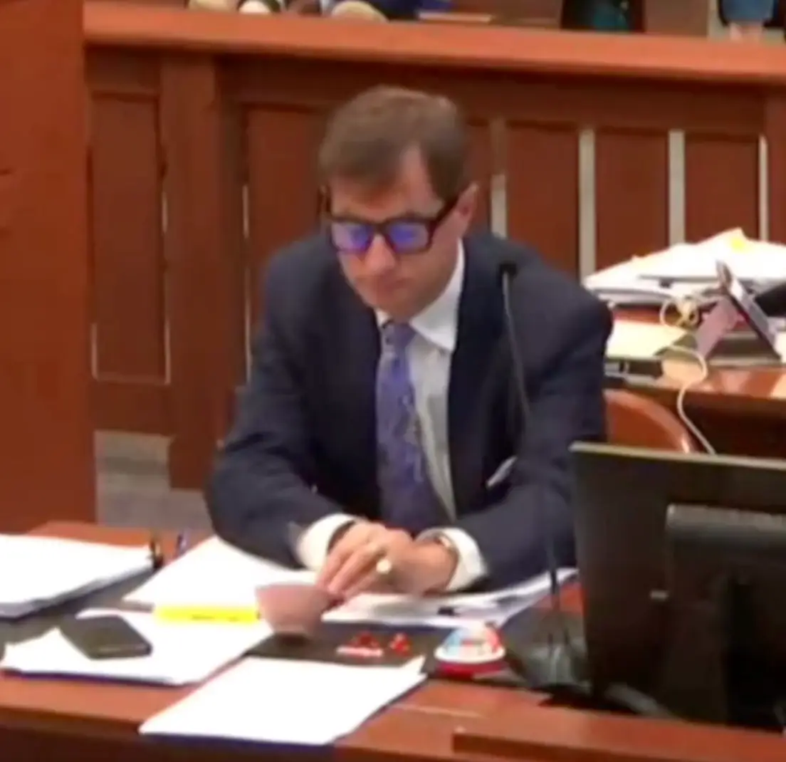 Footage shows Johnny Depp’s lawyer Benjamin Chew taking a huge handful of sweets from his desk in court and putting the candy into his suit jacket pocket.