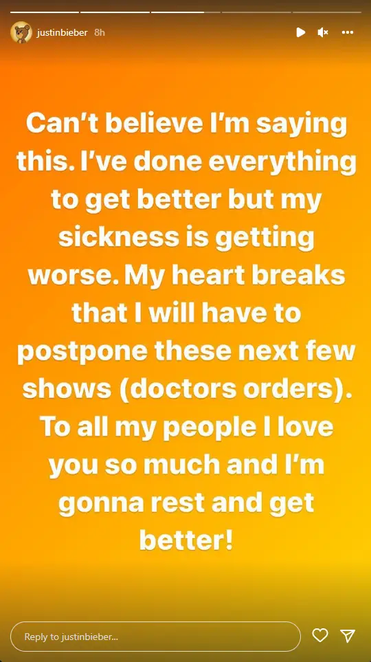 Earlier this week, Bieber posted on his Instagram Stories to announce that he would be postponing his ‘next few shows’ due to an undisclosed illness.