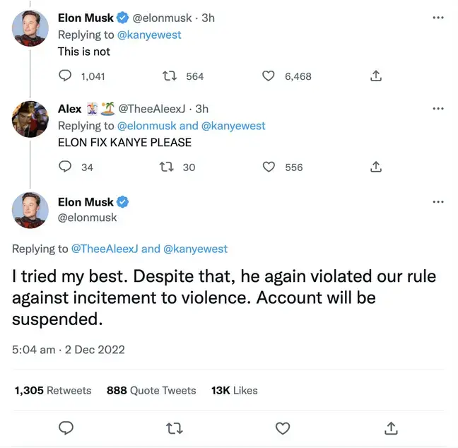 It didn't take long for Elon Musk to suspend Ye's account and told him off for going too far.