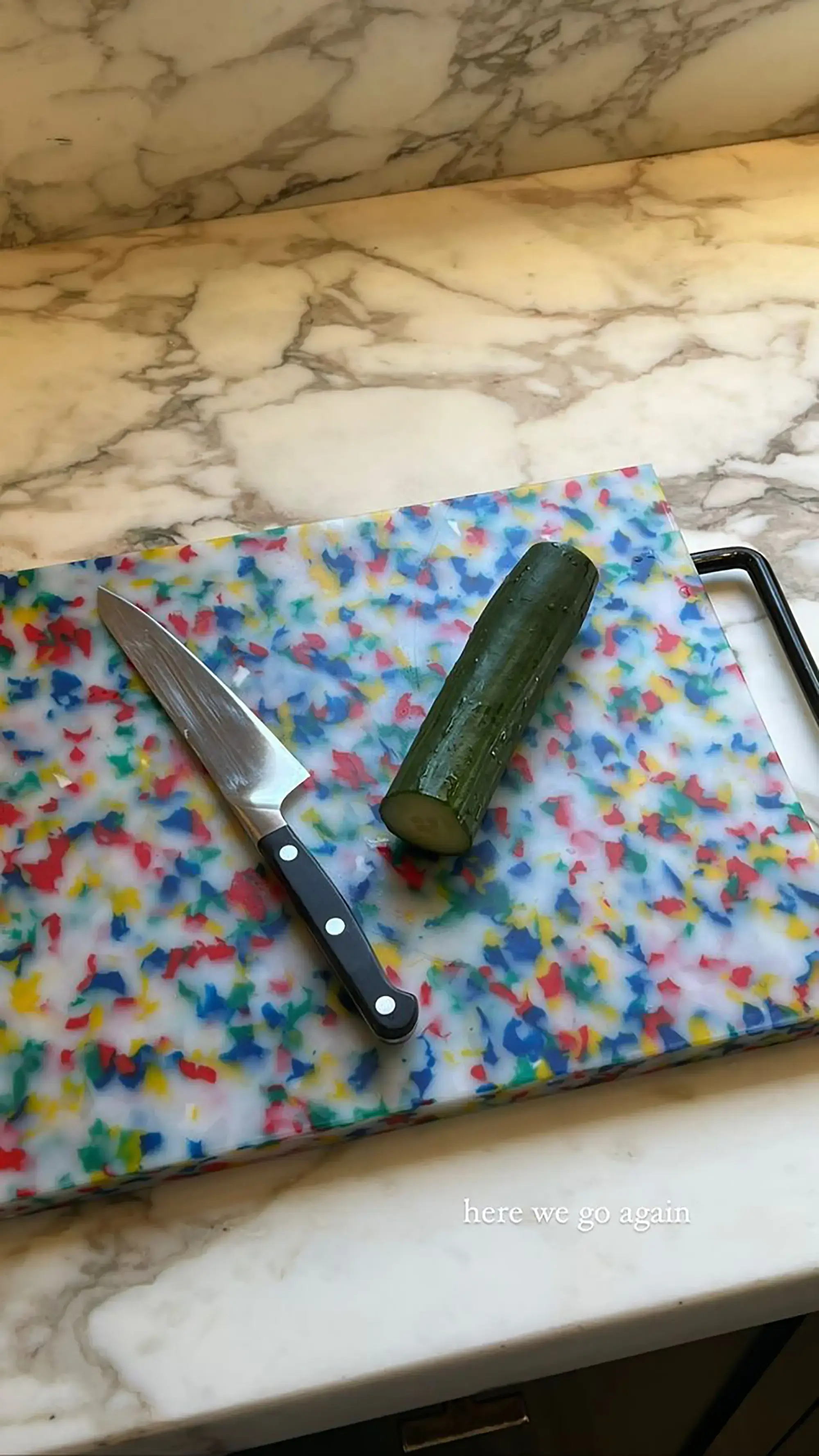 Posting a photo of a cucumber resting on a cutting board next to a knife, Jenner wrote: “Here we go again.”