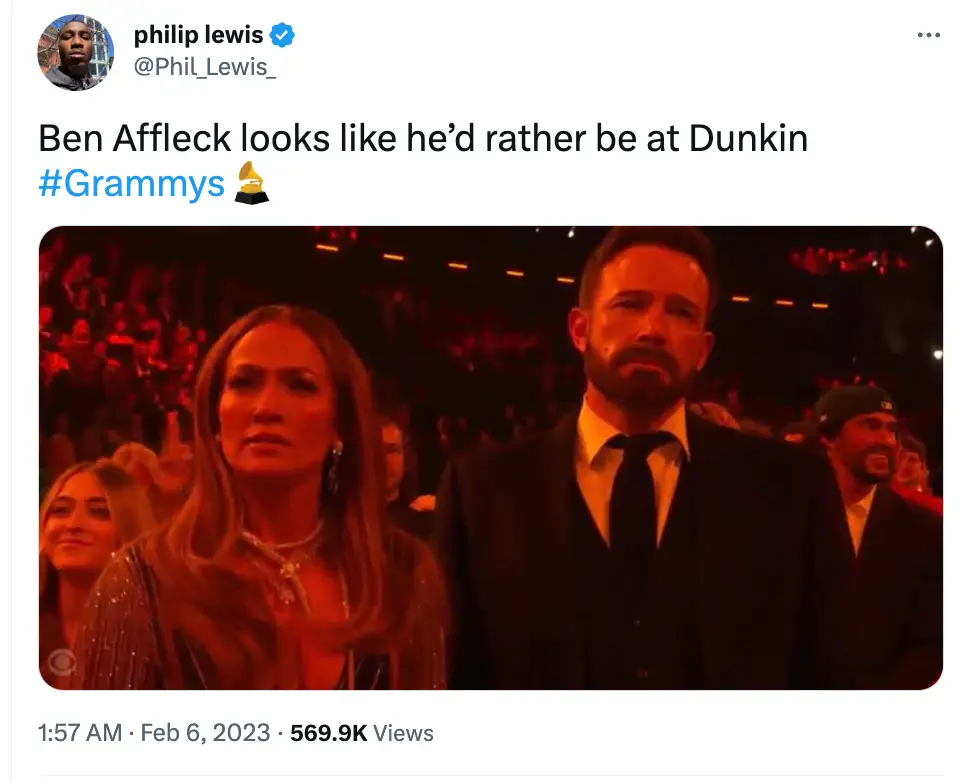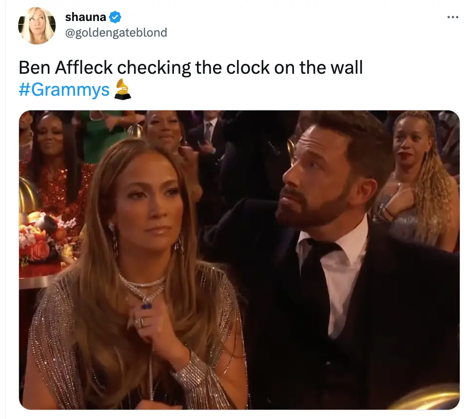 A third commented: “Ben Affleck at the Grammys is me any time I have to be on a Zoom call.”