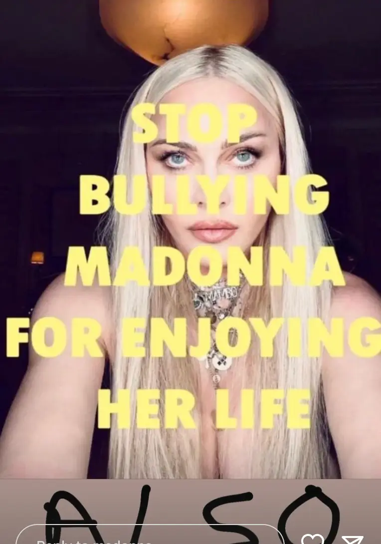 The 'Like A Prayer' singer posted a photo of herself to her Instagram Story, she wrote: "Stop Bullying Madonna For Enjoying Her Life," following it up swiftly with a clip of her lip-syncing to her song 'Give It To Me.'