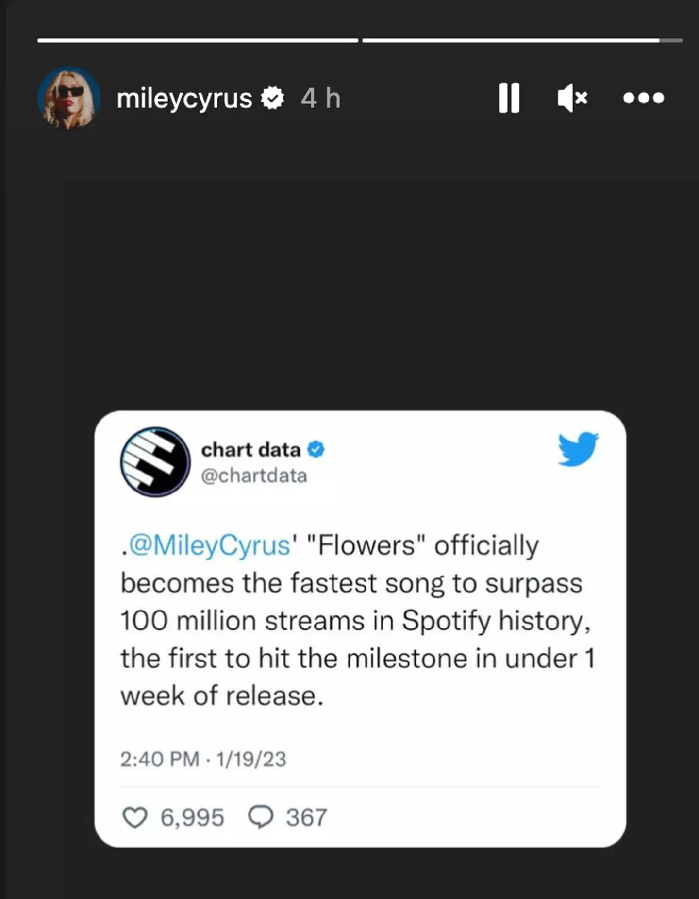Miley seemed pretty thrilled about breaking the record by reposting the Chart Data tweet on her Instagram.