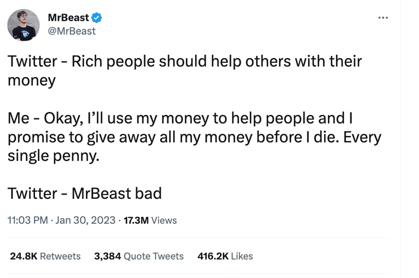 Now, in response to the criticism, Donaldson has shared his own post on Twitter, writing: “Twitter - Rich people should help others with their money