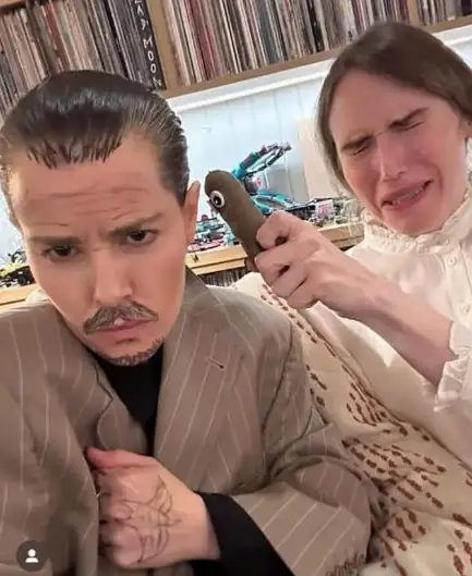 For Halloween 2023, Hampshire decided to rock fake tattoos, a moustache, and a Depp-style suit to complete the look.
