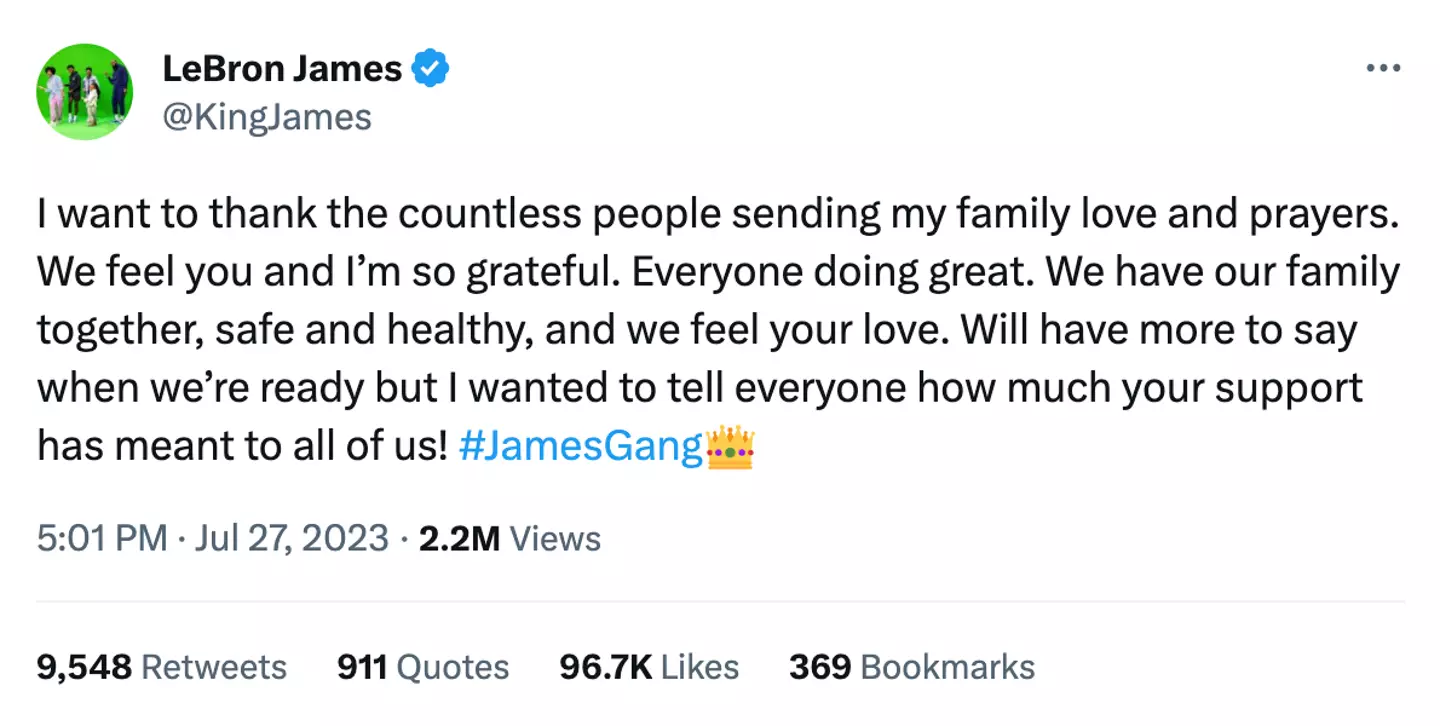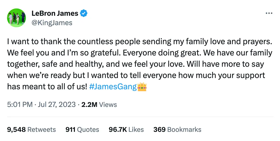 James added: "Will have more to say when we’re ready, but I wanted to tell everyone how much your support has meant to all of us! #JamesGang."