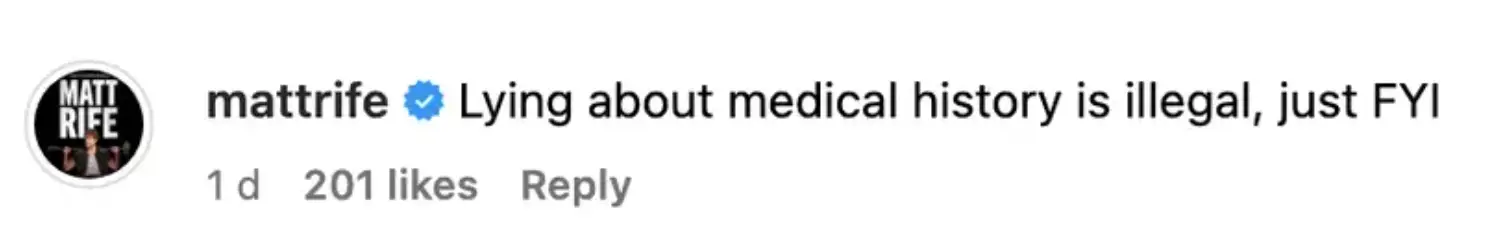 And even though Matt Rife's name was never even mentioned, he decided to comment on the post: “Lying about medical history is illegal, just FYI.”