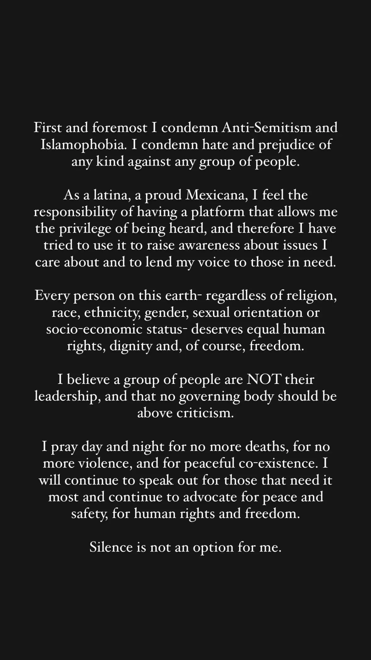 "I will continue to speak out for those that need it most and continue to advocate for peace and safety, for human rights and freedom.