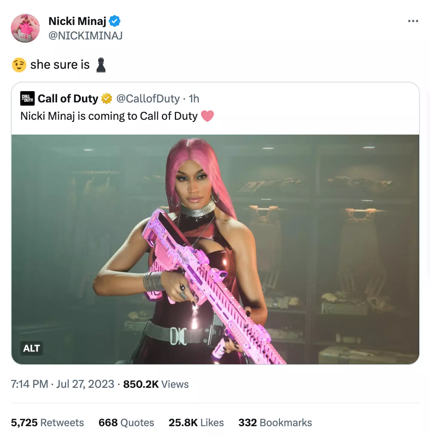 The official Call of Duty Twitter page released the image earlier today (27 July) and captioned the post: "Nicki Minaj is coming to Call of Duty," accompanied with a heart emoji.