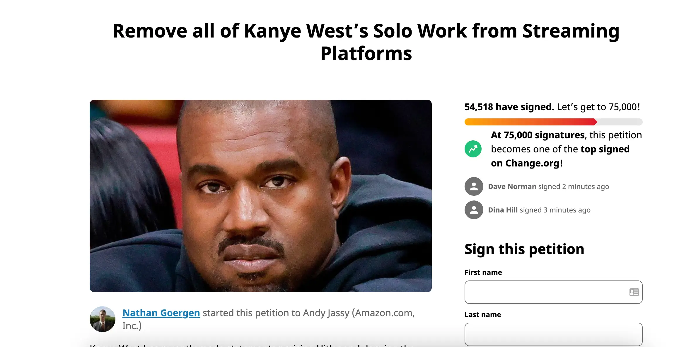 A Change.org petition launched by Nathan Goergen calls on the likes of Spotify, Apple Music and others to remove the Donda rapper's catalogue over his recent anti-semitism remarks.
