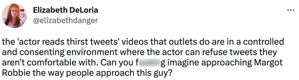After a Twitter user posted the clip on Twitter and dubbed it ‘the worst thing I’ve ever seen’, another fan quote-tweeted the video and said: “The ‘actor reads thirst tweets’ videos that outlets do are in a controlled and consenting environment where the actor can refuse tweets they aren’t comfortable with. Can you f***ing imagine approaching Margot Robbie the way people approach this guy?”