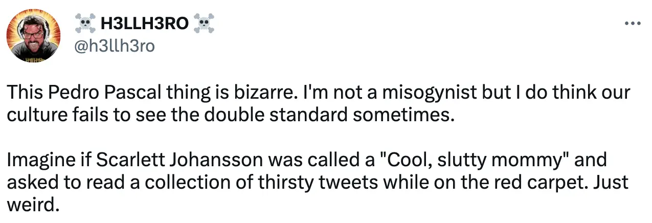 Similarly, another fan wrote: “This Pedro Pascal thing is bizarre. I'm not a misogynist but I do think our culture fails to see the double standard sometimes. Imagine if Scarlett Johansson was called a 'Cool, slutty mommy' and asked to read a collection of thirsty tweets while on the red carpet. Just weird.”