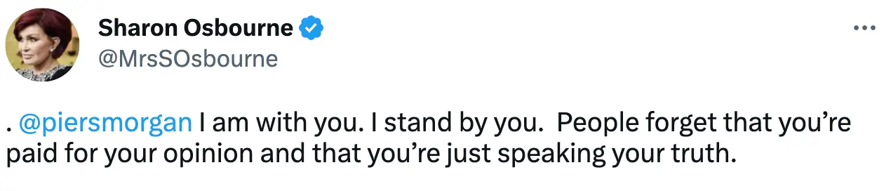 One person who supported the columnist throughout his meltdown and the criticism he received was Osbourne, who tweeted in support of her pal. “@piersmorgan I am with you. I stand by you. People forget that you’re paid for your opinion and that you’re just speaking your truth,” she said, which was met with criticism.