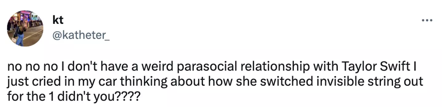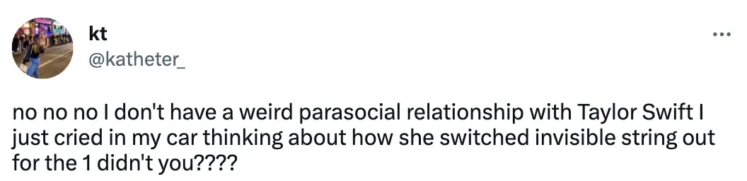 While a third person tweeted: “No no no I don't have a weird parasocial relationship with Taylor Swift I just cried in my car thinking about how she switched invisible string out for the 1 didn't you????"