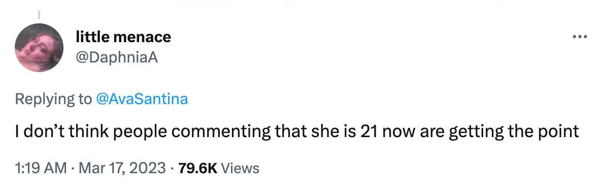 However, one Twitter user responded: "I don’t think people commenting that she is 21 now are getting the point."
