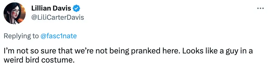One person penned: “I’m not so sure that we’re not being pranked here. Looks like a guy in a weird bird costume.”