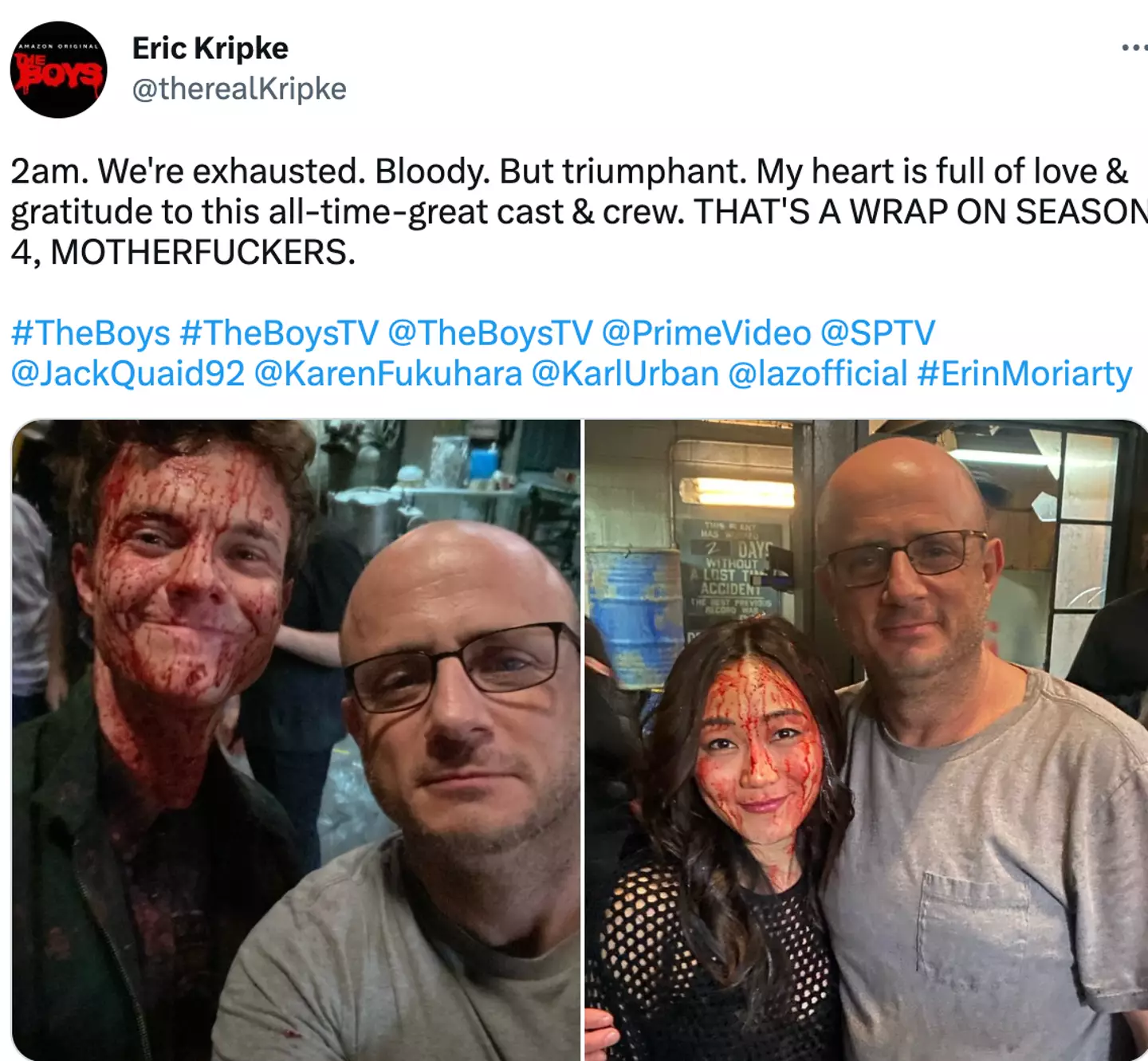 Sharing the photos to Twitter, showrunner Eric Kripke wrote at the time: "We're exhausted. Bloody. But triumphant.