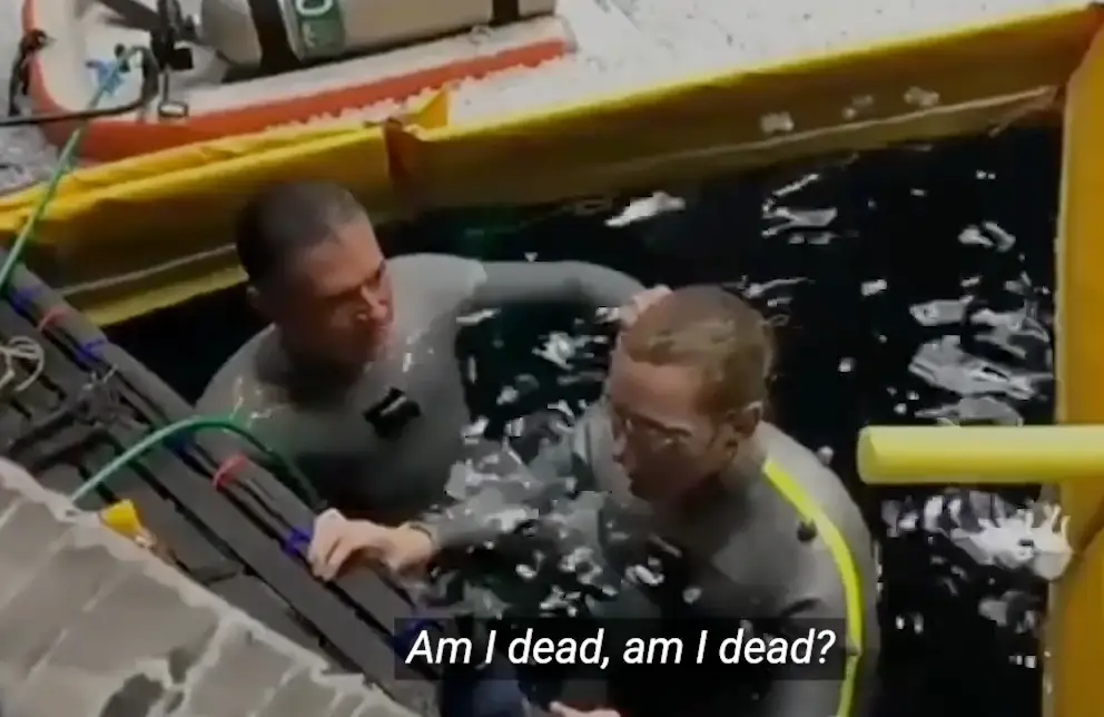 After popping her head out of the water to get her breath back, the trainer asks Winslet to predict how long she lasted.