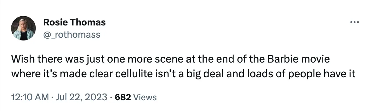 "Wish there was just one more scene at the end of the Barbie movie where it’s made clear cellulite isn't a big deal and loads of people have it," wrote a final Twitter user.