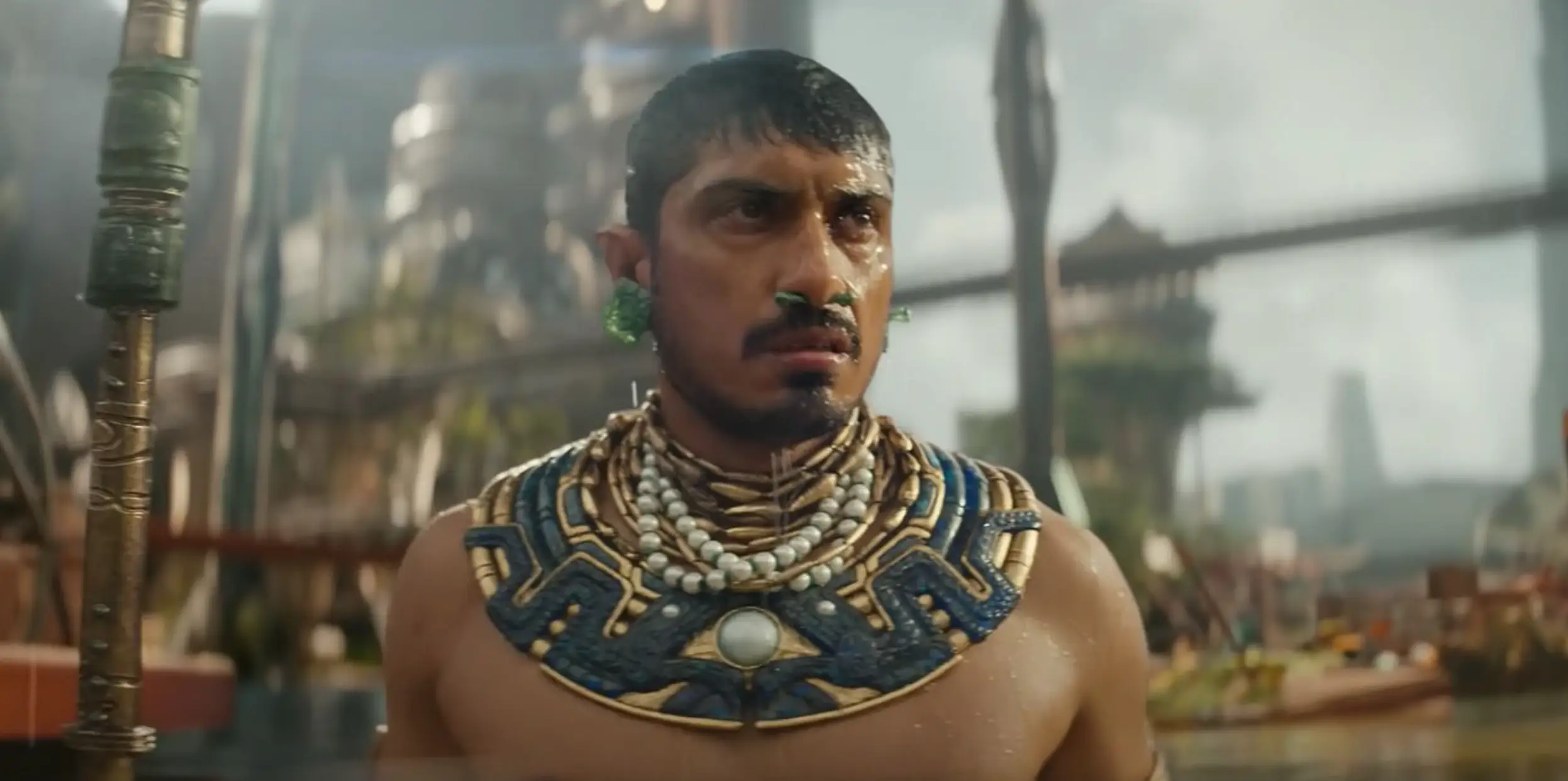 The movie's villain is half human, half Atlantean royalty, and his outfit of choice tends to be a skimpy pair of green shorts with some gold arm and shin plates.