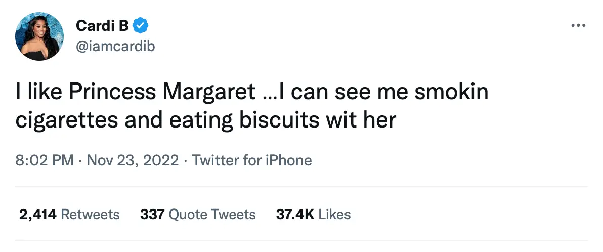 Cardi B has said she’d like to ‘eat biscuits’ and smoke cigarettes with Princess Margaret after revealing she's a big fan of The Crown.