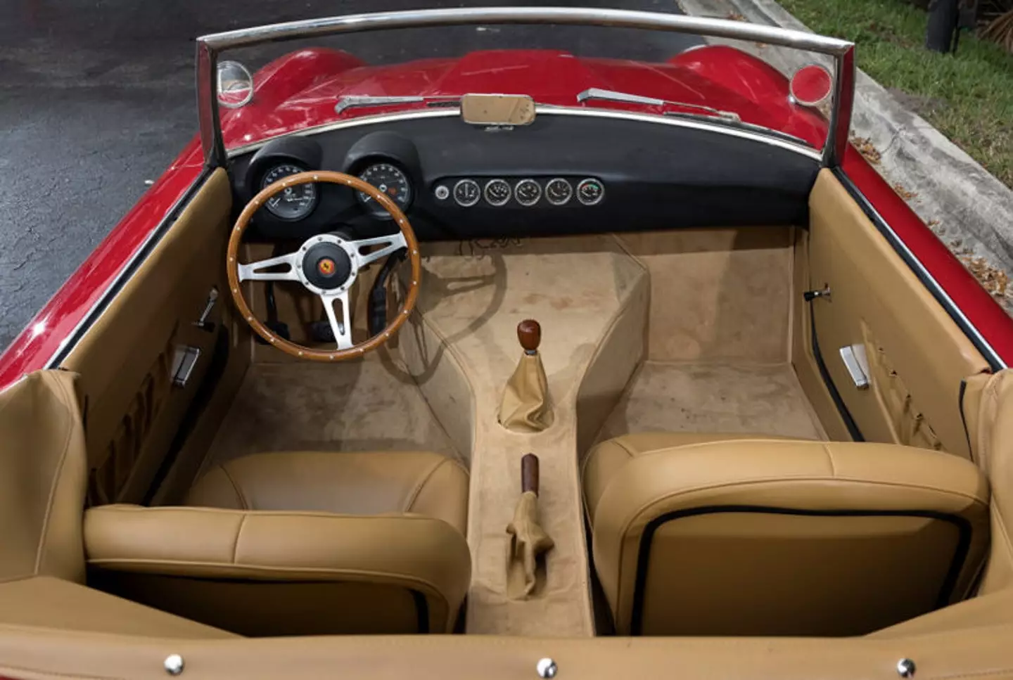 "It consists of a fiberglass body bolted to a rolling chassis with cosmetically finished interior with tan vinyl seats, tan carpeting, matte black fiberglass dashboard with instrumentation and wood-trimmed steering wheel replete with replica 'prancing horse' logo at center.